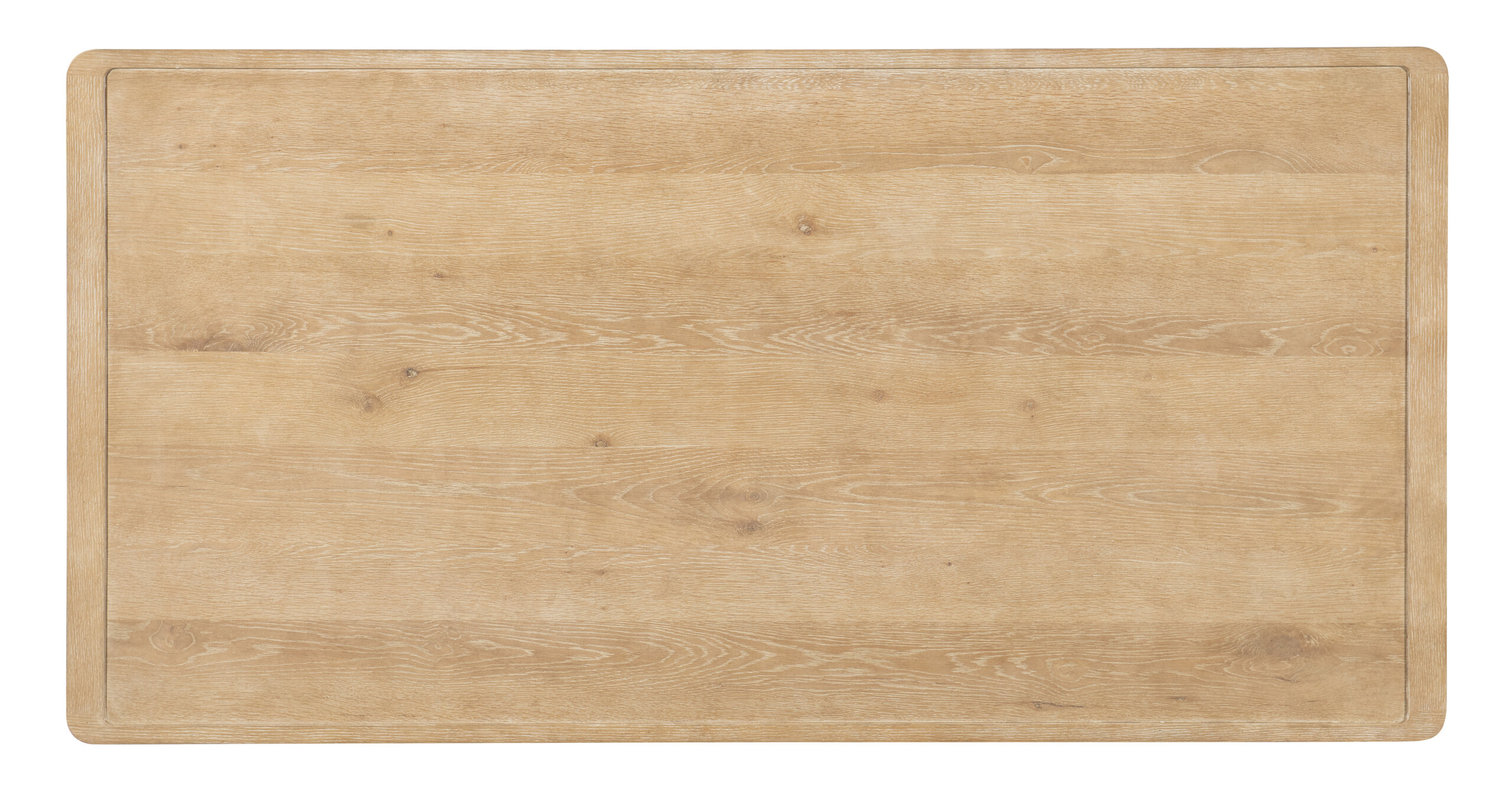 Sublime and serene with clean modern lines, the Retreat Executive Desk has a tranquil personality packed with contemporary function to make your work easier. Crafted of Oak and Maple Veneers with a Solid-Wood Edged Top, the desk is finished in the sand-colored Dune finish, transparent by design to reveal the unique grain patterns of the wood veneer. Soft pewter round knobs and bar pulls complete the Zen vibe. Functional features include seven drawers, with the left and right top drawers having two removable dividers, one pencil tray and one writing slide that can be used on either side. The center drawer has a drop-front for keyboard use. There are two locking utility drawers, each with removable dividers, and two locking file drawers at the bottom, along with a grommet for wire management on each side towards the back of the desk. Finished on all sides.