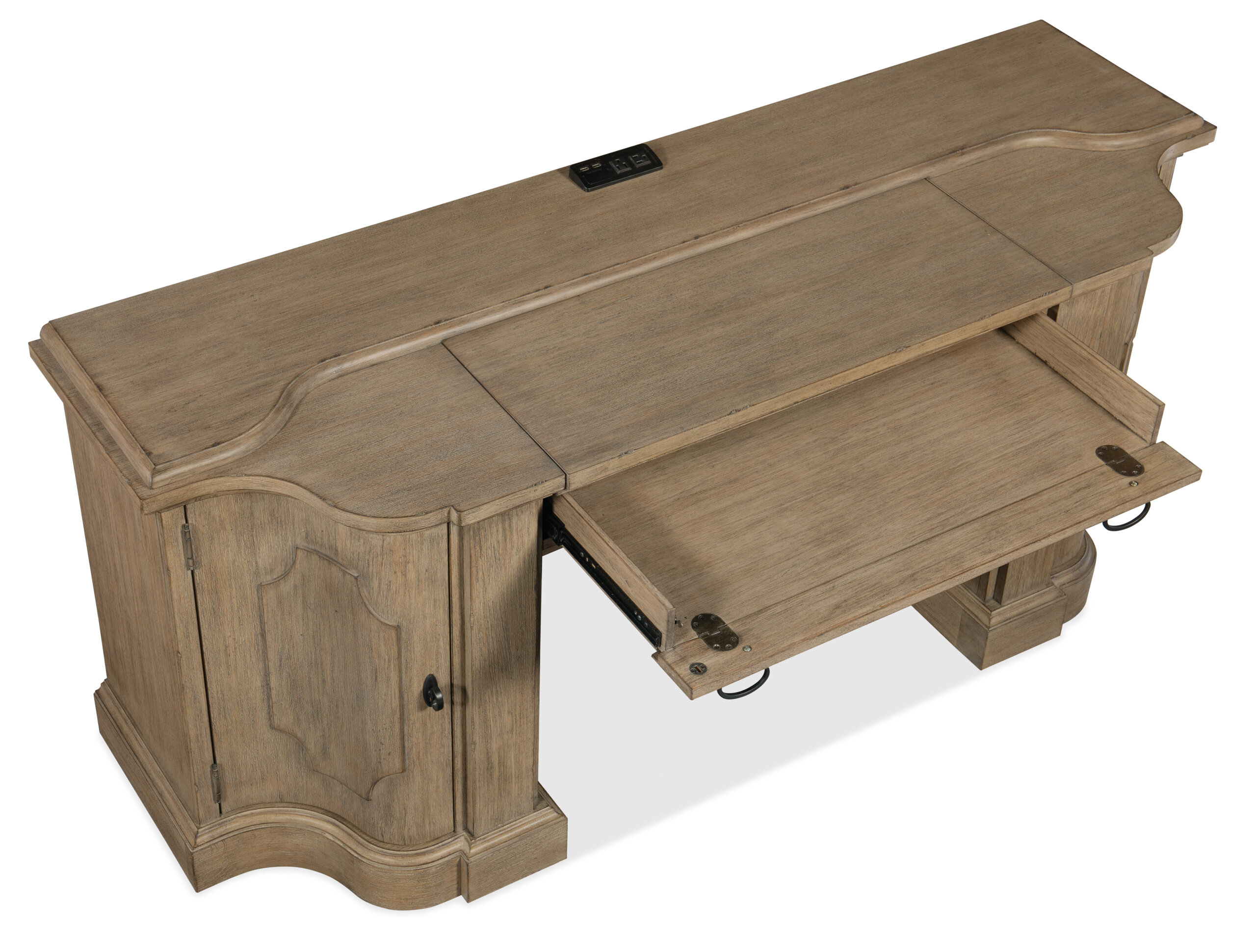 With a casual attitude and a sun-washed ambience inspired by the Mediterranean island for which it is named, the Corsica Computer Credenza is crafted of Acacia Veneers with a wire-brushed, artisan light natural finish with reclaimed character. Stylish details include a scallop-like carved base, shaped doors and ring pulls in a burnished bronze finish. There’s one adjustable shelf behind each door and one drawer with a drop-front for keyboard use. The desk top area above the center drawer has a pullout for added work surface. A FC627 power bar with two electrical outlets and two USB ports is on the top, and the back panel has ventilation and wire holes.