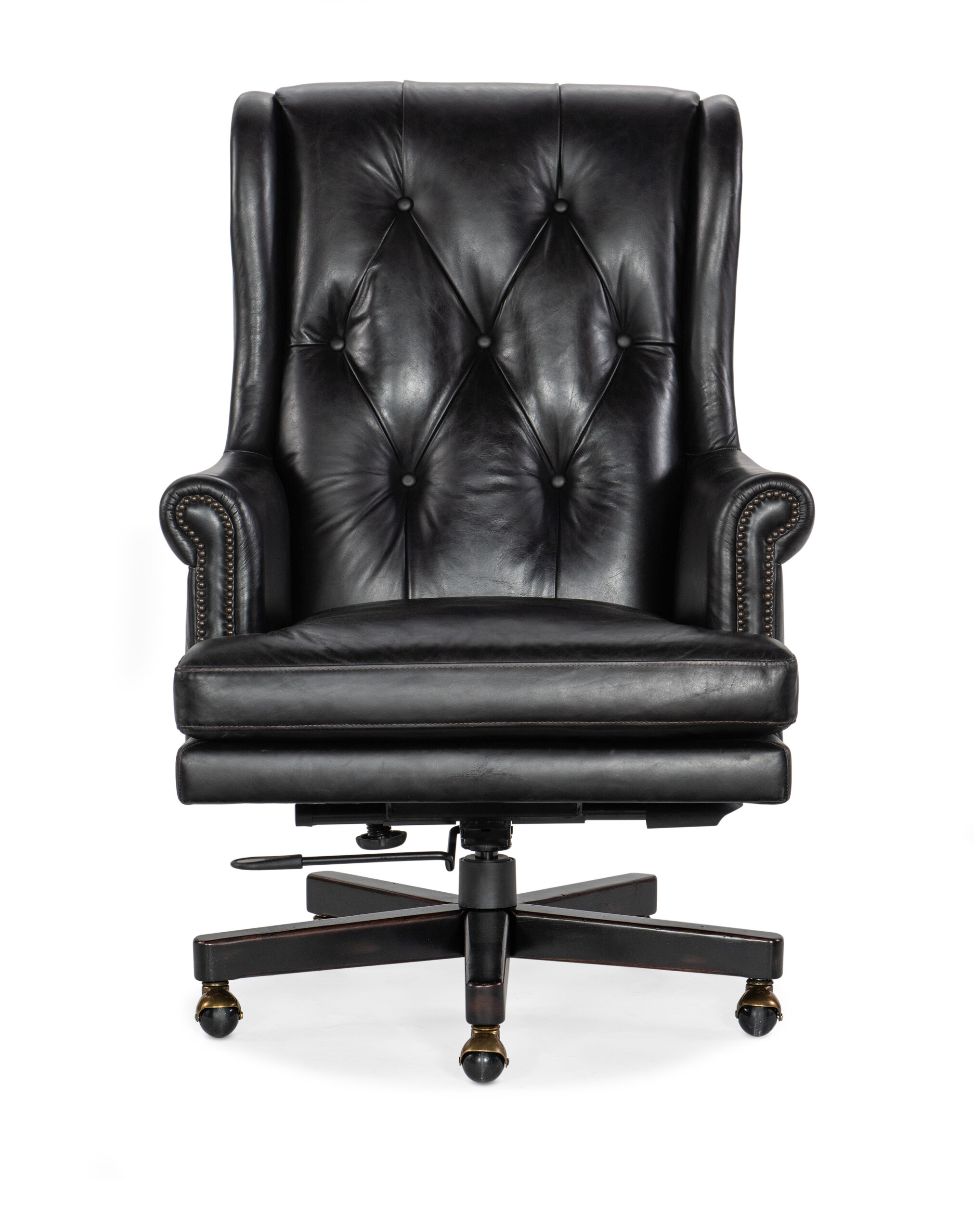 In a clean monochromatic and timeless look, the classic Charleston Executive Swivel Tilt Chair has a diamond-patterned tufted back, understated wings and nailhead trim. It is upholstered in the Old Saddle Black aniline top-grain leather with a correlating black-finished wood base. On casters.