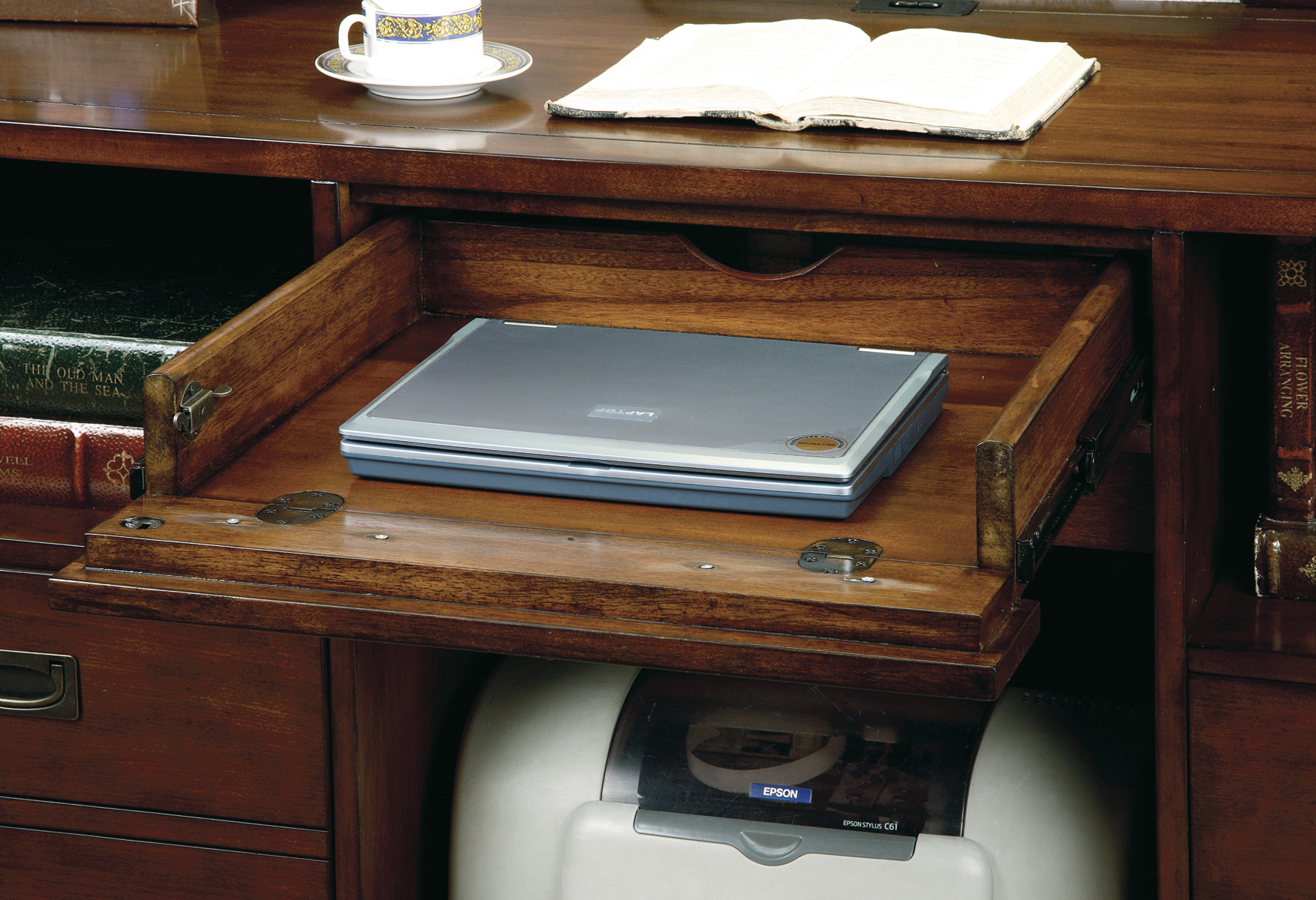 Inspired by British Campaign-style sea chests, the Danforth Open Credenza is crafted of Birch Solids and Cherry Veneers in a rich medium brown finish with recessed campaign hardware. Offering stylish storage, the credenza has a top center drawer with drop-front for keyboard, 3 adjustable shelves, two file drawers with Pendaflex letter/legal file system and a printer pullout tray. There’s a FC625 Power Director II power center.