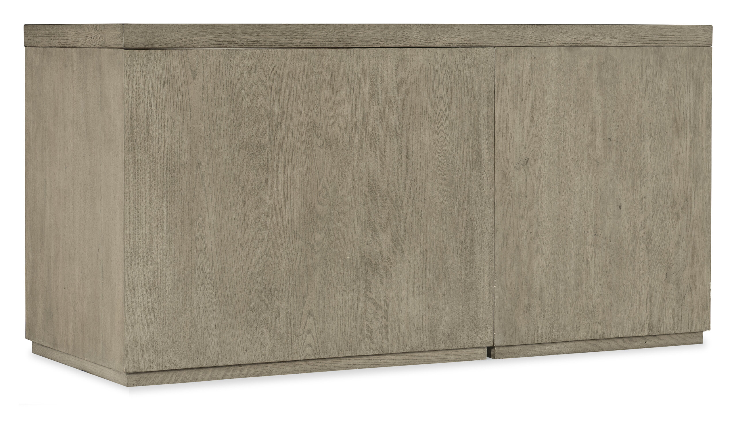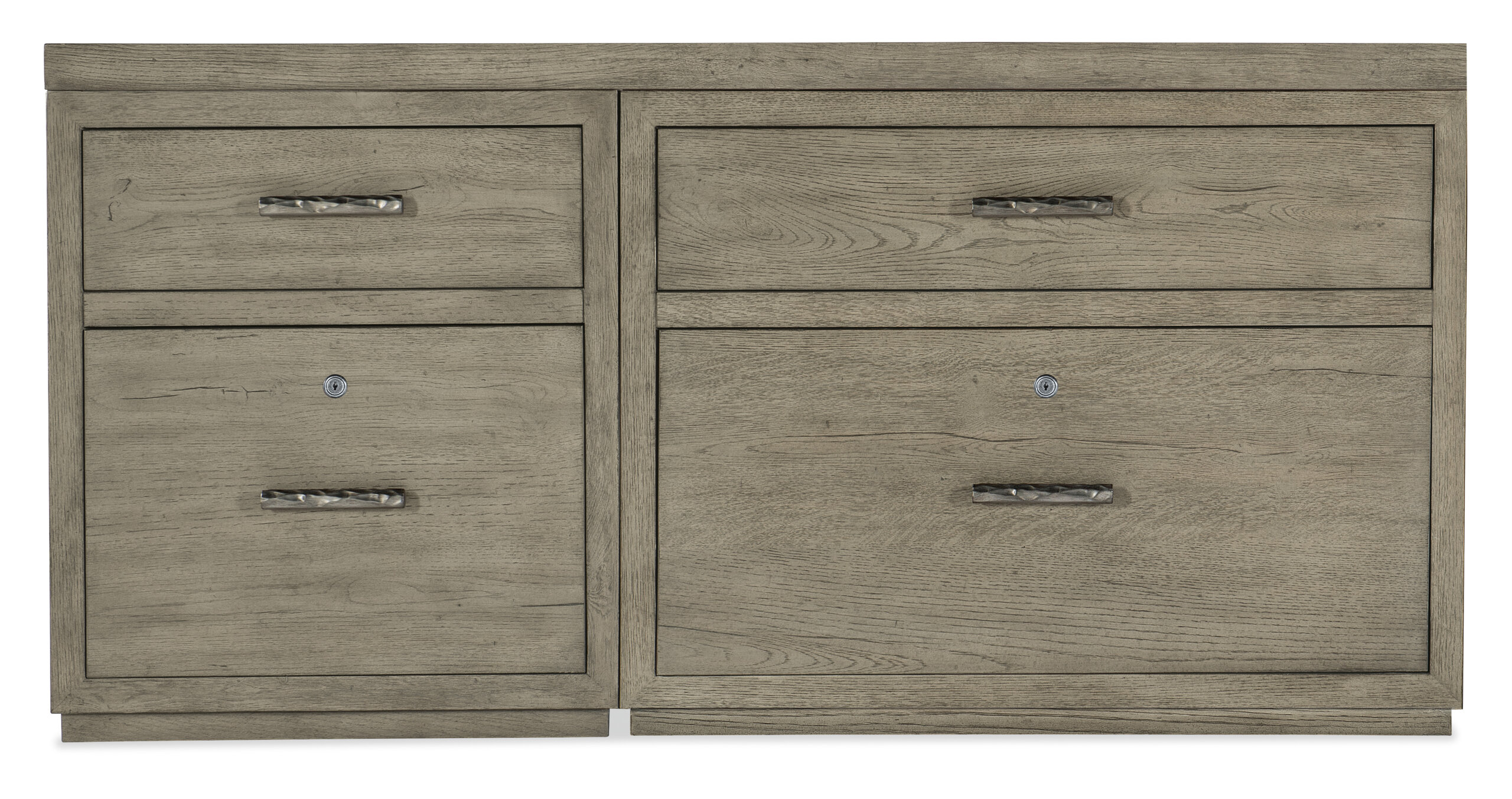 With a rustic weathered smoked gray Mink finish and clean modern lines, the multi-functional Linville Falls Credenza includes a roomy 60-inch top, a small file on one side and a lateral file on the other. Altogether, there are 4 drawers, including 2 top utility drawers, and the lower drawers are locking file drawers with pendaflex filing systems. Fully finished on the back, the desk can be floated in a room.