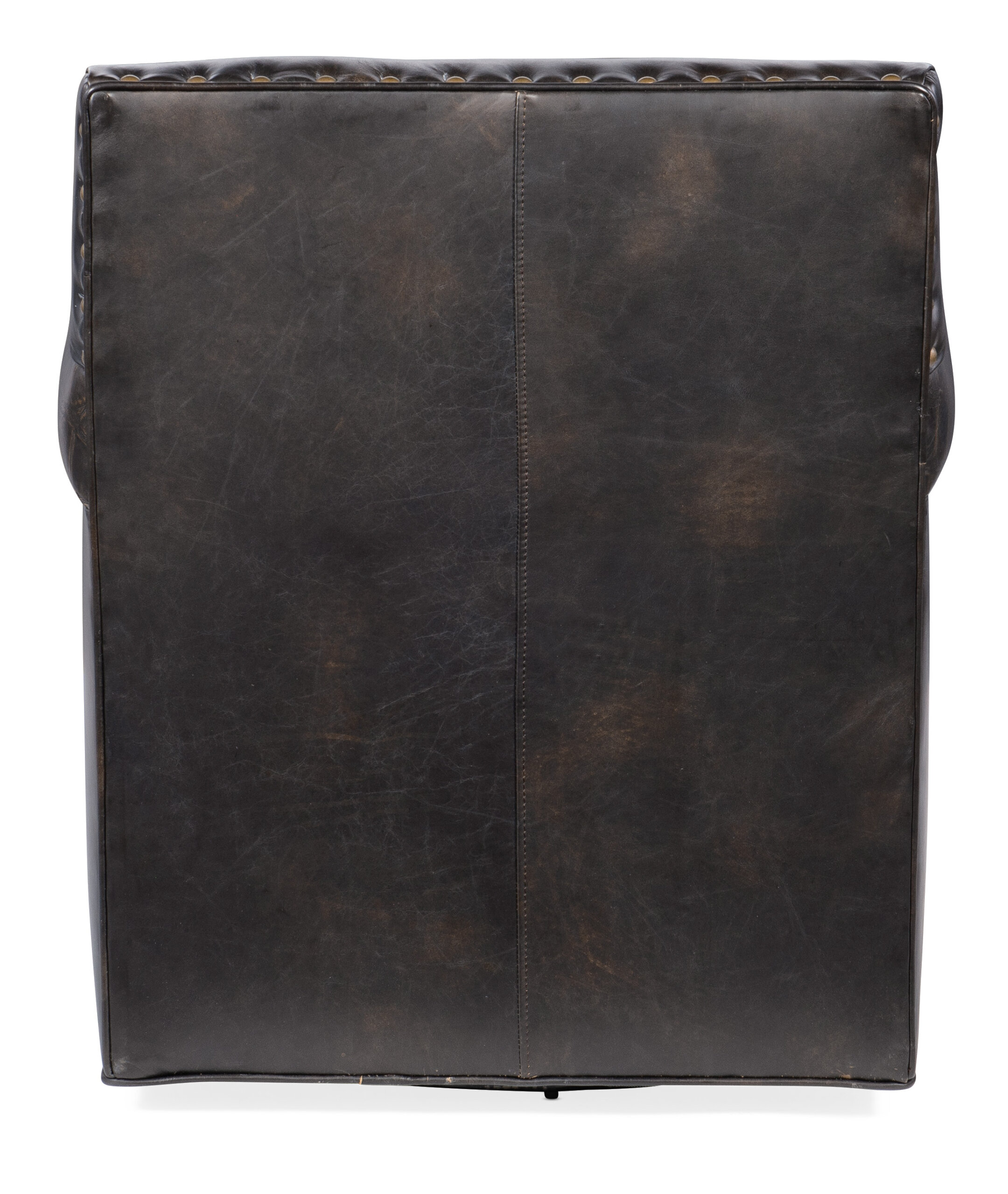 A vintage leather club chair with a chic menswear vibe, the Potter Swivel Club Chair is offered in the parchment-colored Bedford Goldington handwiped aniline top-grain leather. The arms and base are trimmed in nailhead.