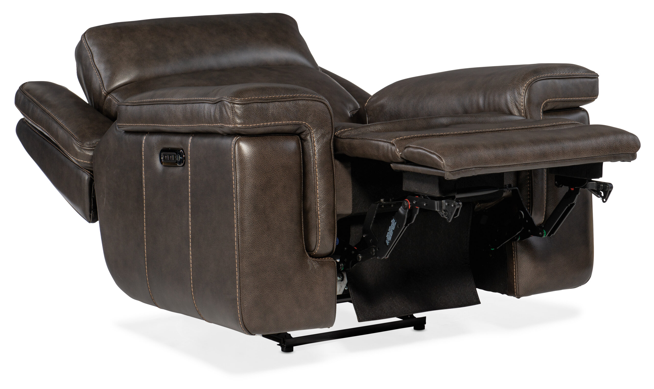 Chunky and comfy in the chic Cosmos Cocao finished top-grain leather, the Montel Power Recliner has it all: smooth reclining motion to the lay-flat position, a power headrest, adjustable lumbar support and a USB port. Tailoring details include a bustle-style back and decorative top stitching.