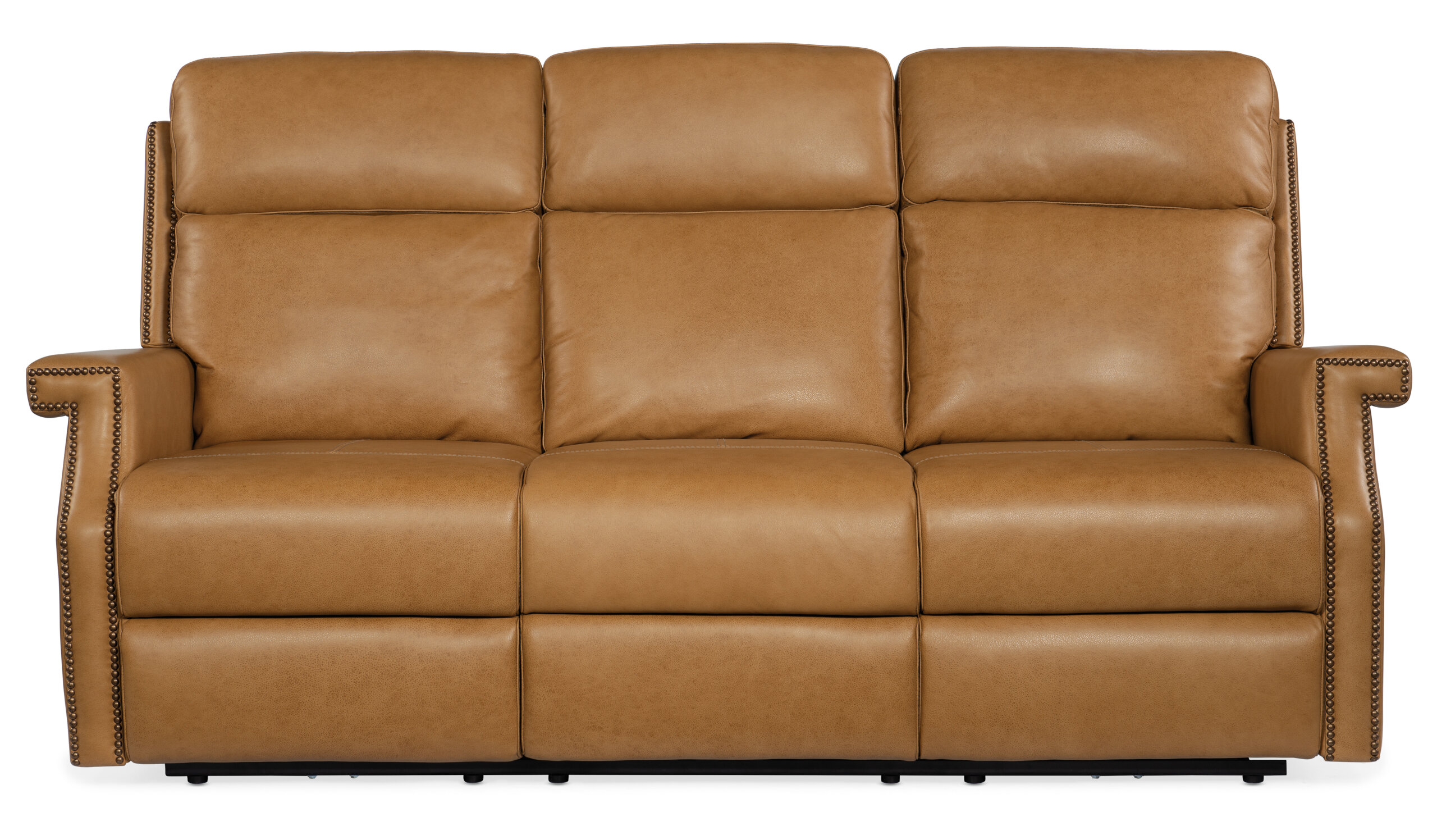 In a chic transitional, well-tailored design, the Vaughn Zero Gravity Sofa with Power Headrest is offered in the soft, butterscotch-colored finished top grain leather called Shattered Coin. Reclining at the touch of a button with a zero-gravity feature that gives you the feeling of being suspended in air for maximum comfort, the recliner has a bustle-style back and vintage gold nailhead trim. Includes USB port to charge your device while you relax.