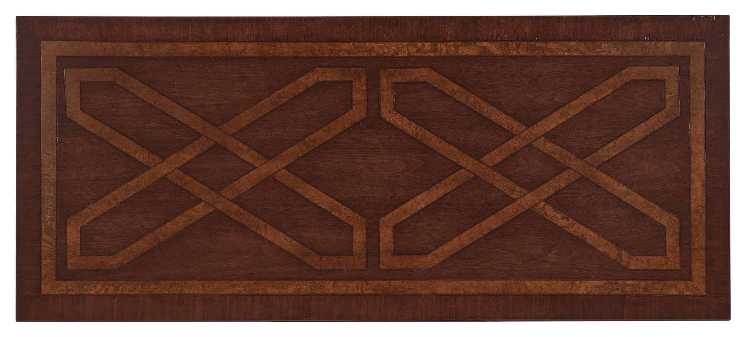 In a casual yet sophisticated traditional style, the Charleston Rectangle Cocktail Table has an intriguing criss-cross inlay design and border on the top and an interlocking stretcher. Crafted of Black Walnut Veneers and Olive Ash Burl with Walnut Inlay, it is finished in Maraschino Cherry, finished using natural grain Cherry veneers showcasing the dramatic cathedral patterns of the wood.
