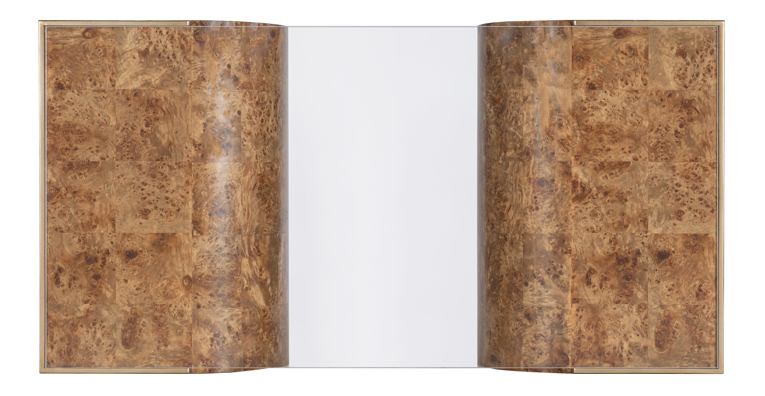 Earthy and intriguing, the Burlesque Coffee Table is crafted of Mappa Burl Veneers in a tile pattern in two half-oval sections connected with a clear tempered glass top and gold trim on the top complementing the warm golden finish of the piece.