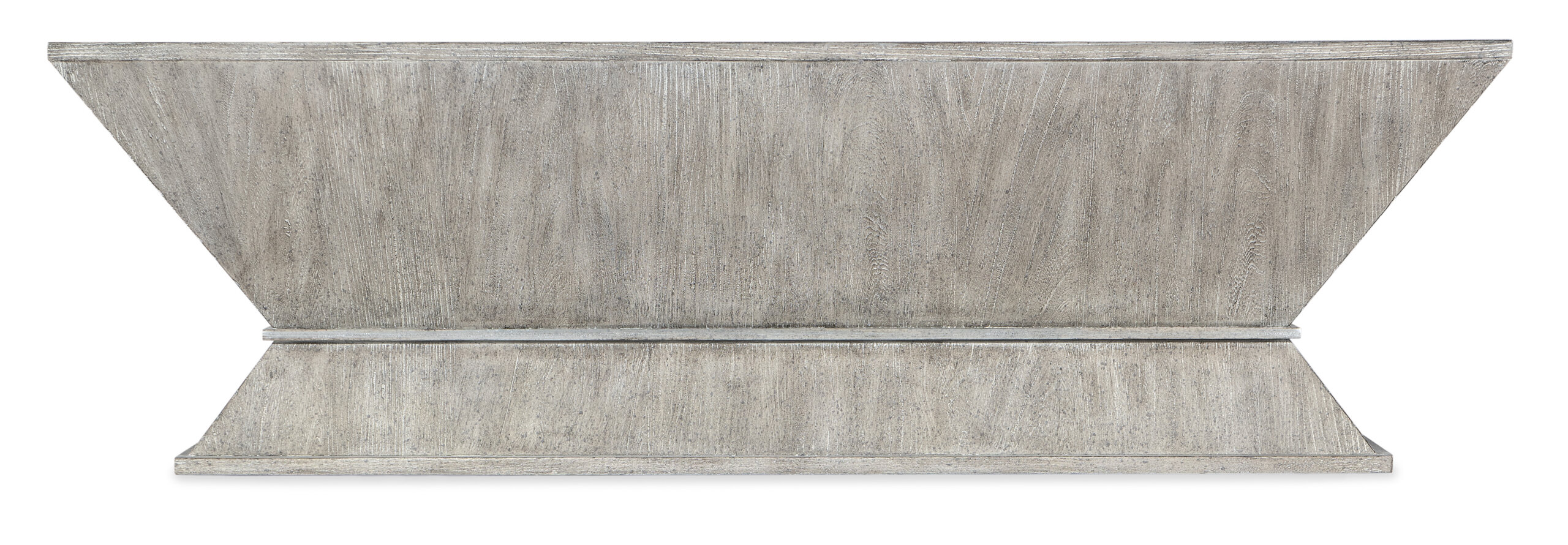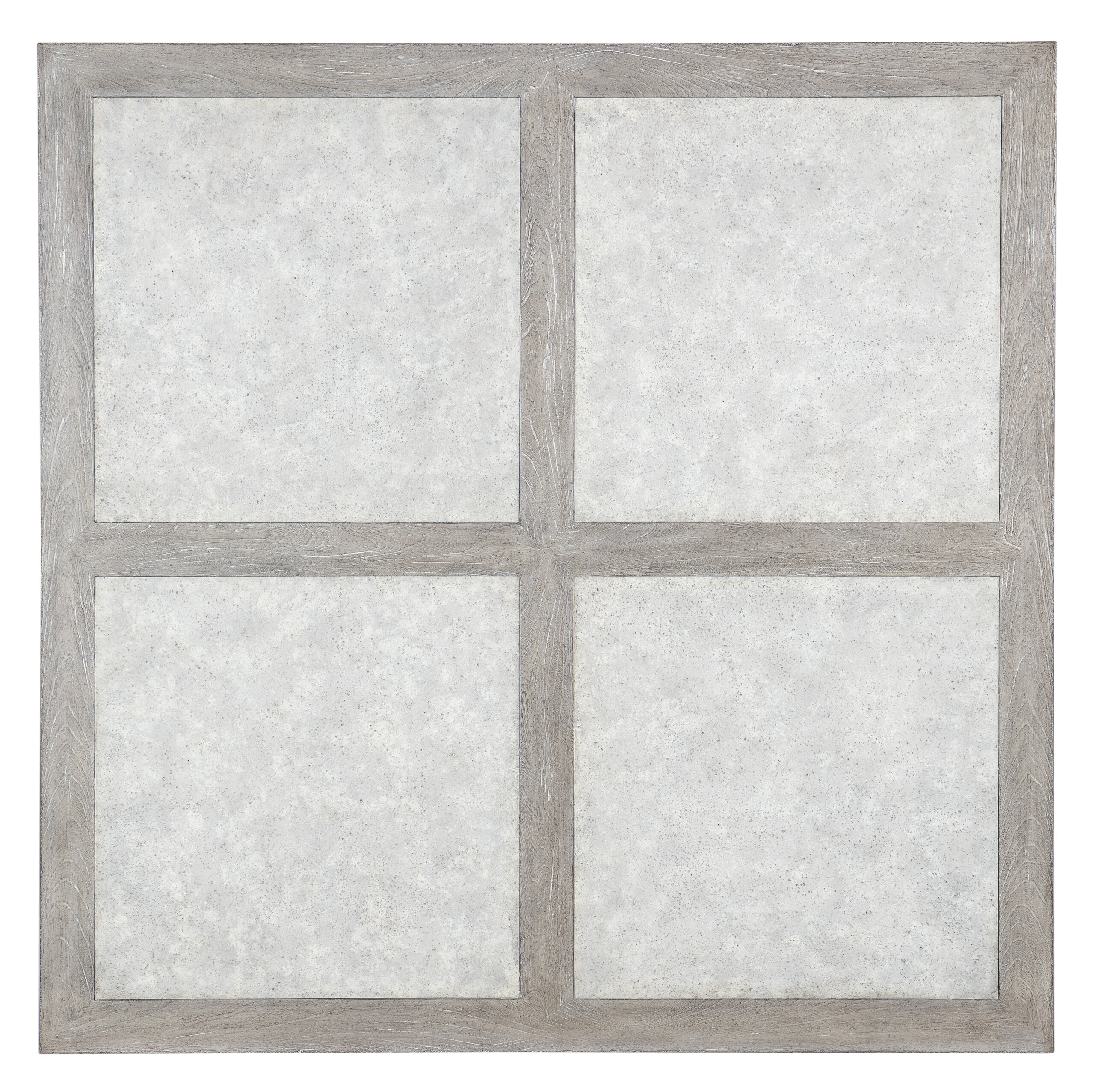 With a chic chunky shape and four paned stone-like panels on the top, the Korena Cocktail Table has a casual organic look with a serene gray finish over Elm Veneers and resin.