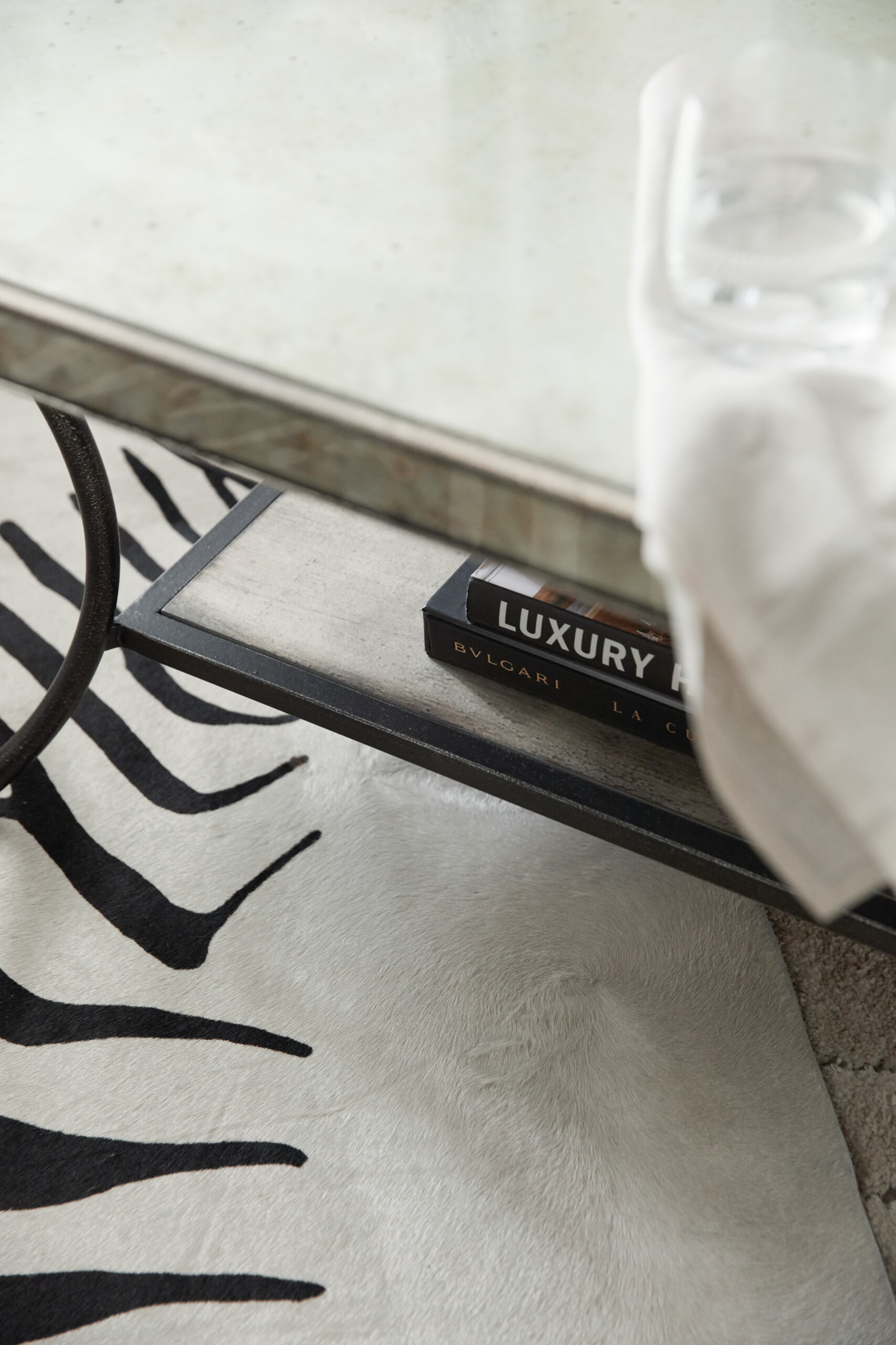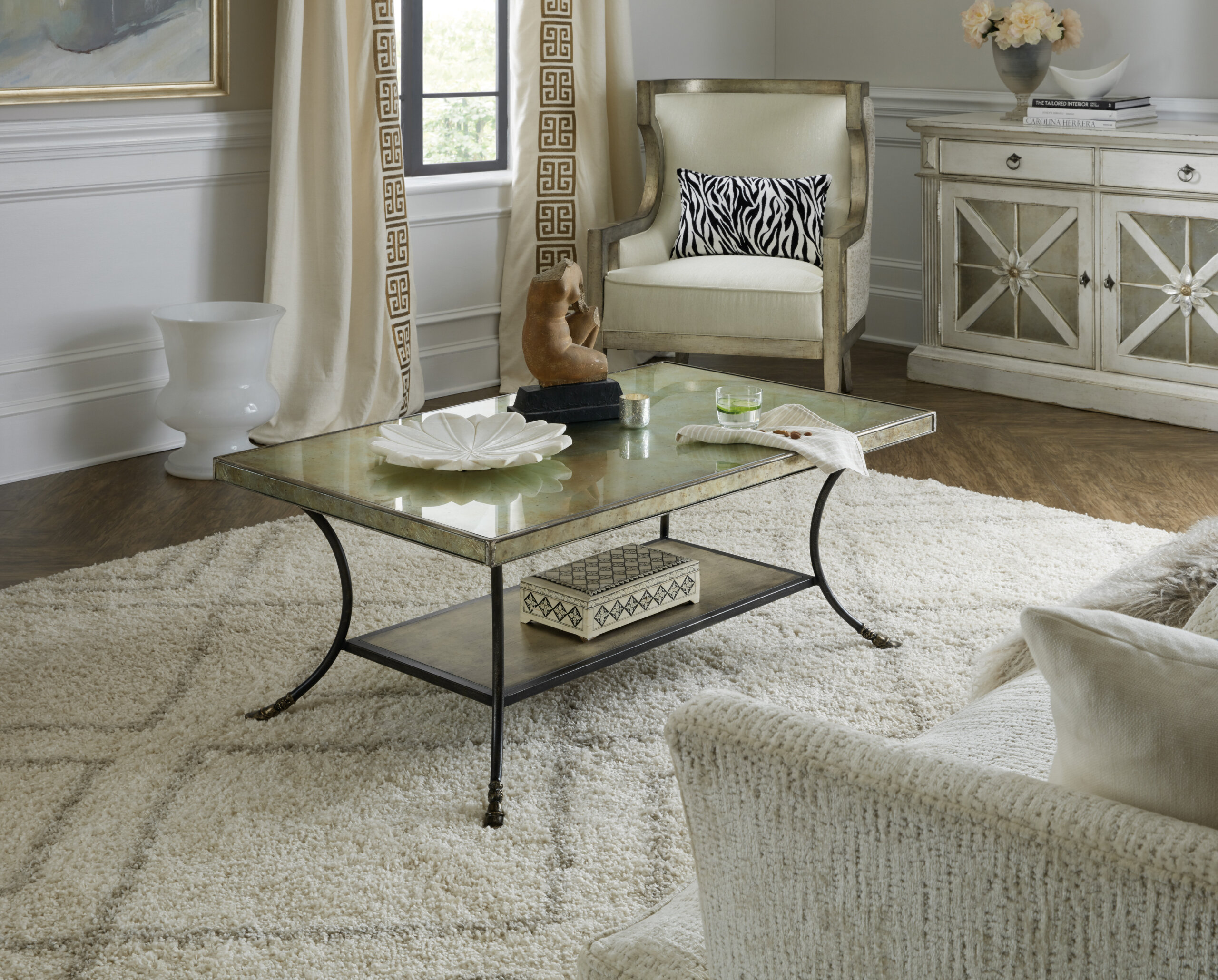 Bold and dramatic yet light and airy, the Sanctuary Lisette Cocktail Table is a couture combination of Oak Veneers and glass, blending the silver Jewel finish with rich undertones of gold and champagne with Metal Noir, a dark antiqued metal, accented with a glimmering eglomise.