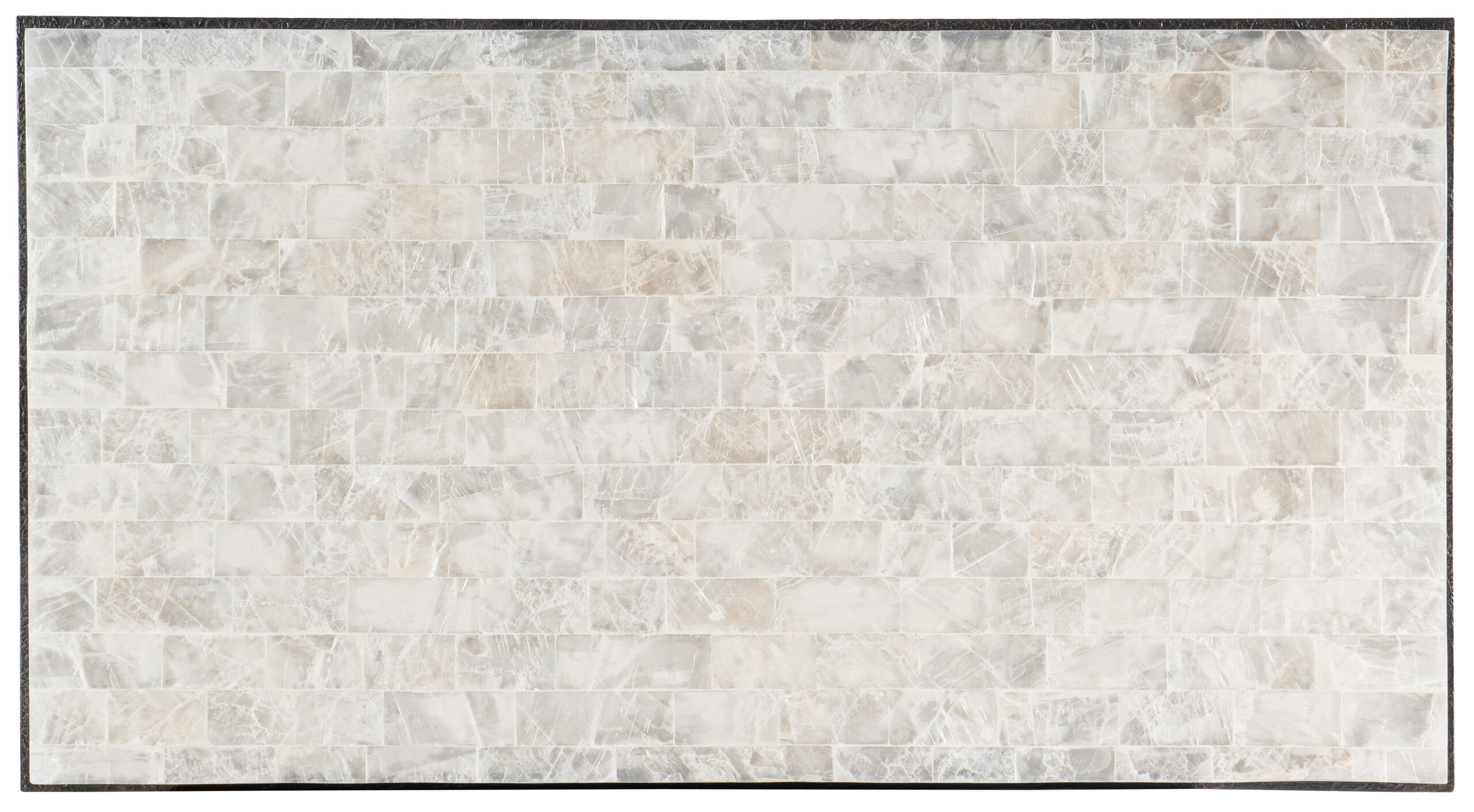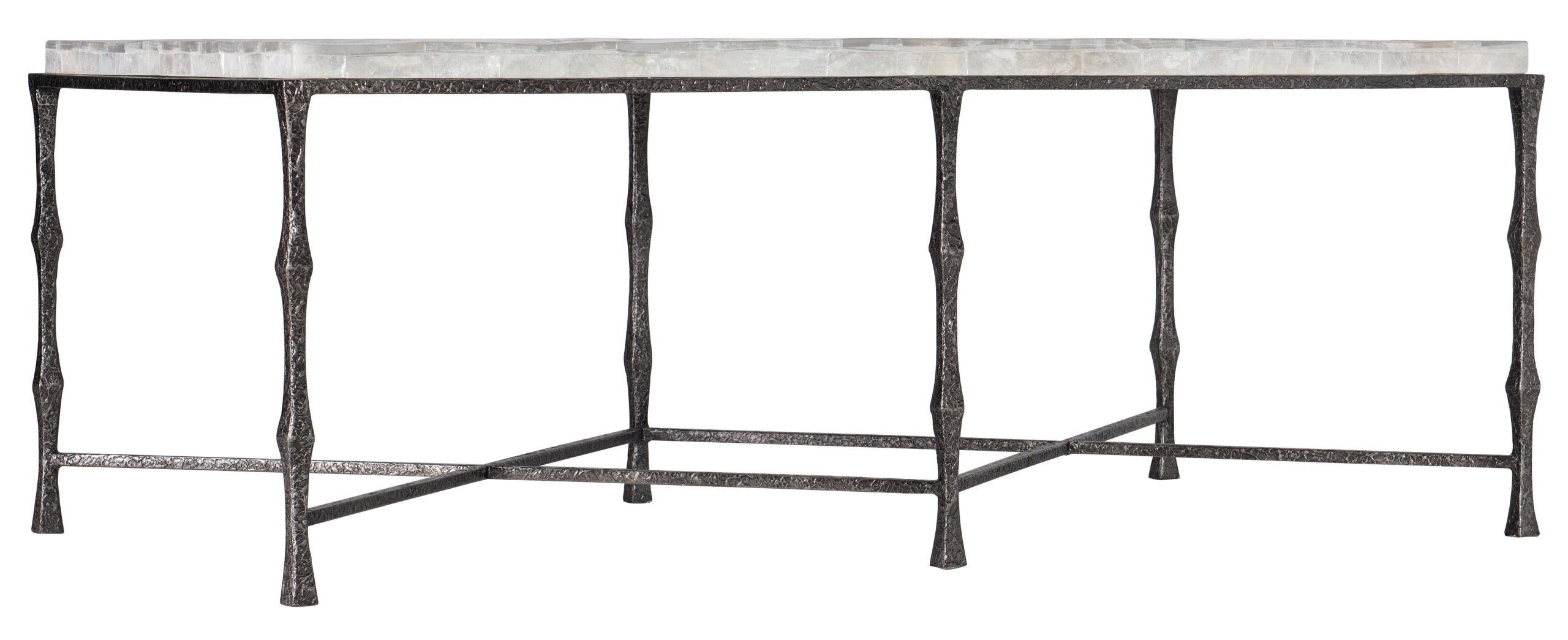 A delightful medley of natural materials and organic color tones, the versatile Surfrider Coffee Table has a Gypsum top in a multicolored blend of whites, creams and beiges and six charcoal-colored distressed metal legs and stretchers.