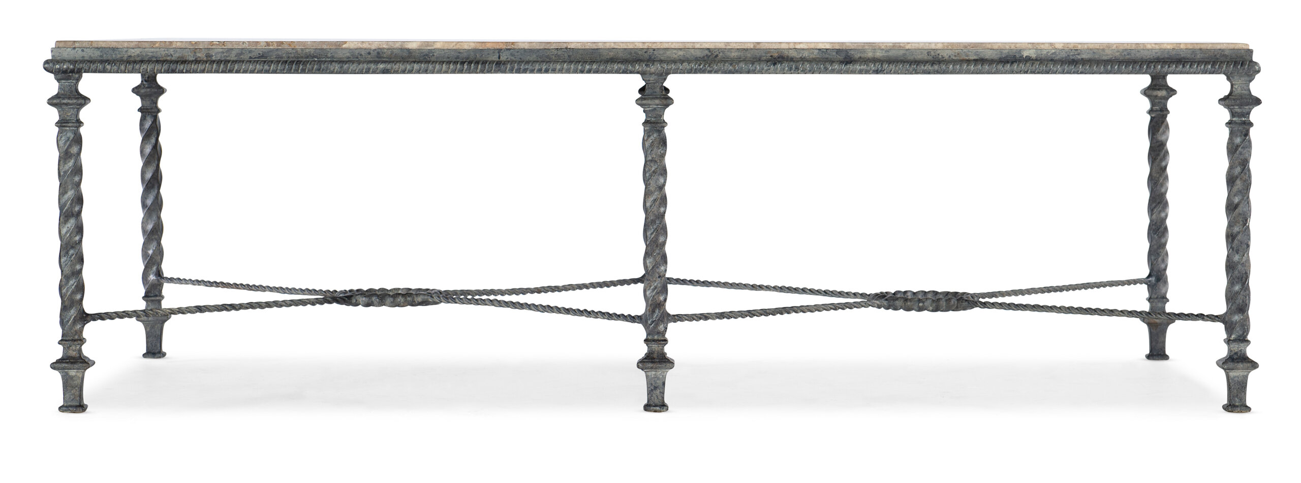 Create a comfortable and inviting atmosphere of retreat for your family room with the Traditions Rectangle Cocktail Table, combining a stone veneer top in gray and brown tones with a verdigris metal base with twisted legs and a stretcher.