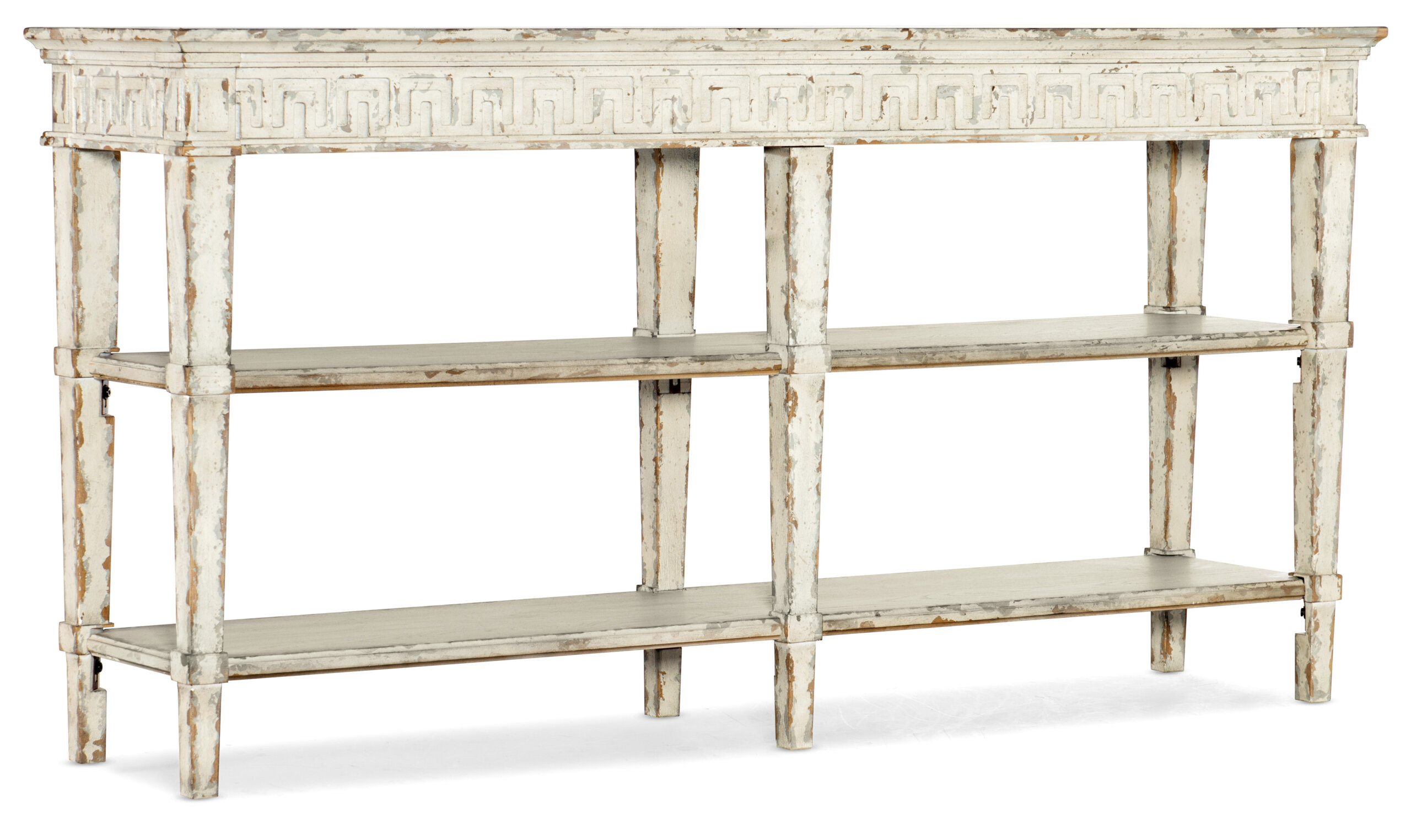 Neoclassic meets shabby chic with the Cadence Console Table, featuring classical design motifs and the delightful Latte Froth white distressed finish with gray undertones. At 15 ½ inches deep, it fits well in narrow spaces and offers 2 fixed shelves for storage or display.