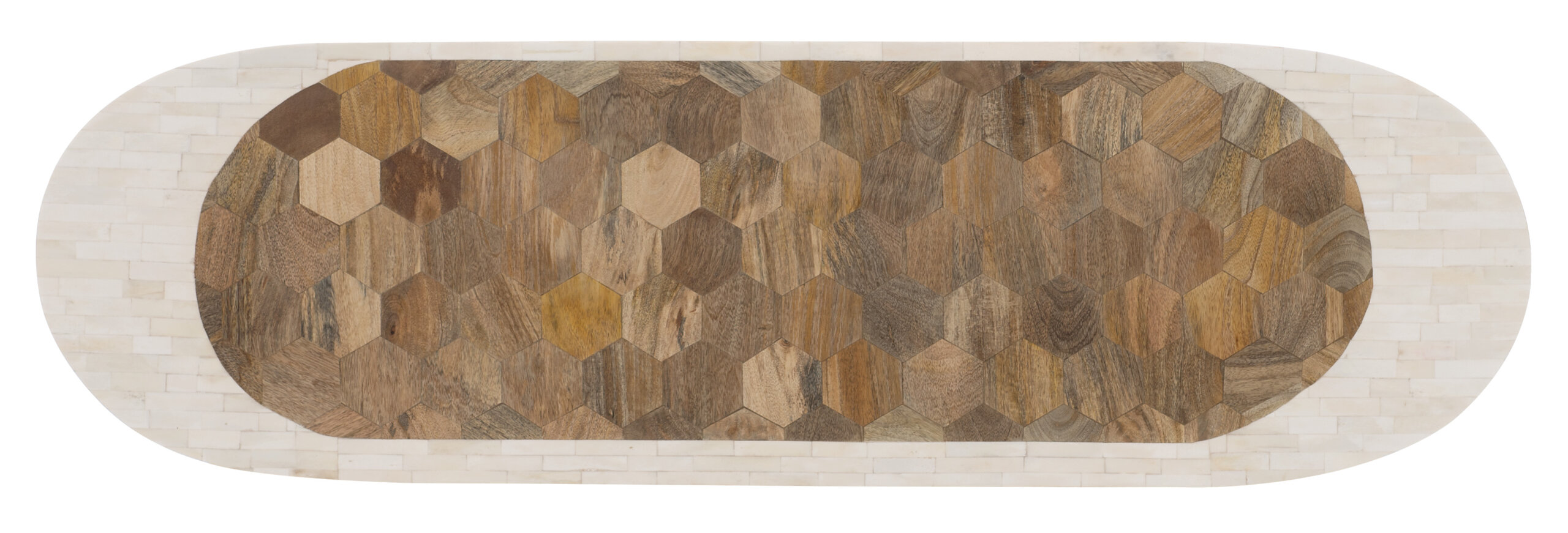In an appealing oval shape and featuring an eclectic mix of natural materials and stylish surface interest, the Commerce & Market Console Table has a space saving 14 ½-inch depth and combines a lightly-scaled bronze metal base and stretchers with a two-tone natural bone inlay top in shades of cream and brown.