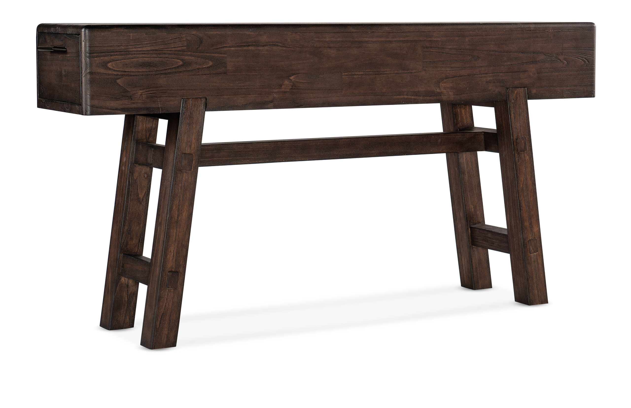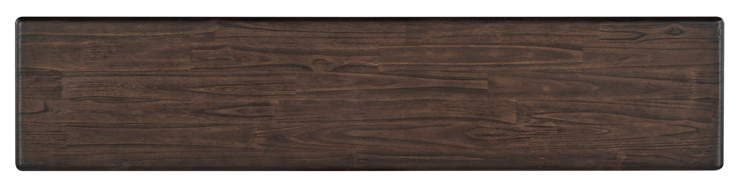 Crafted of Mindi Solids in a Pommel Horse Design, the Commerce & Market Sofa Console features a dark wood finish with metal bar pulls in a charcoal finish and one self-closing drawer on each end.