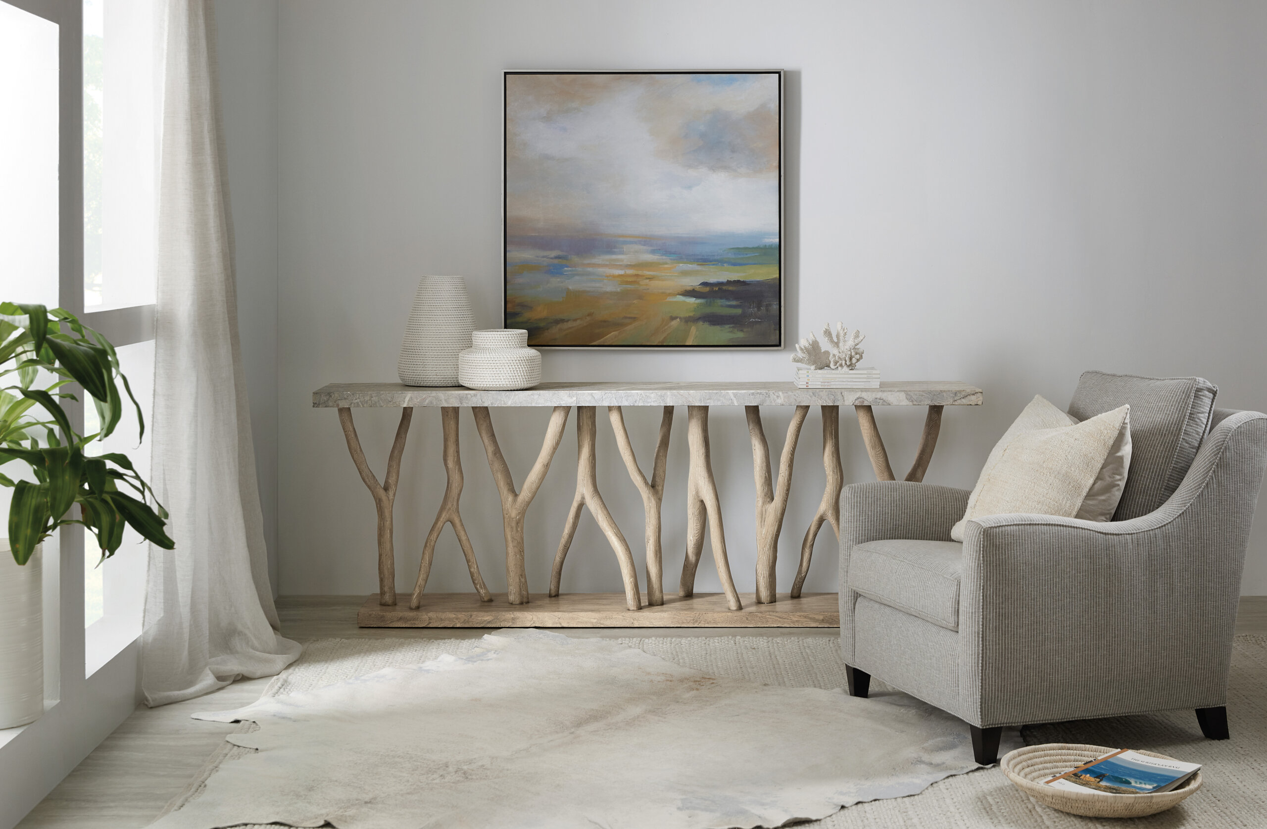 An artistic accent of organic elegance, the Surfrider Console Table has a stone veneer top and a tree branch motif base, with the base crafted of Pecan Veneers in a light-and-airy wood finish.