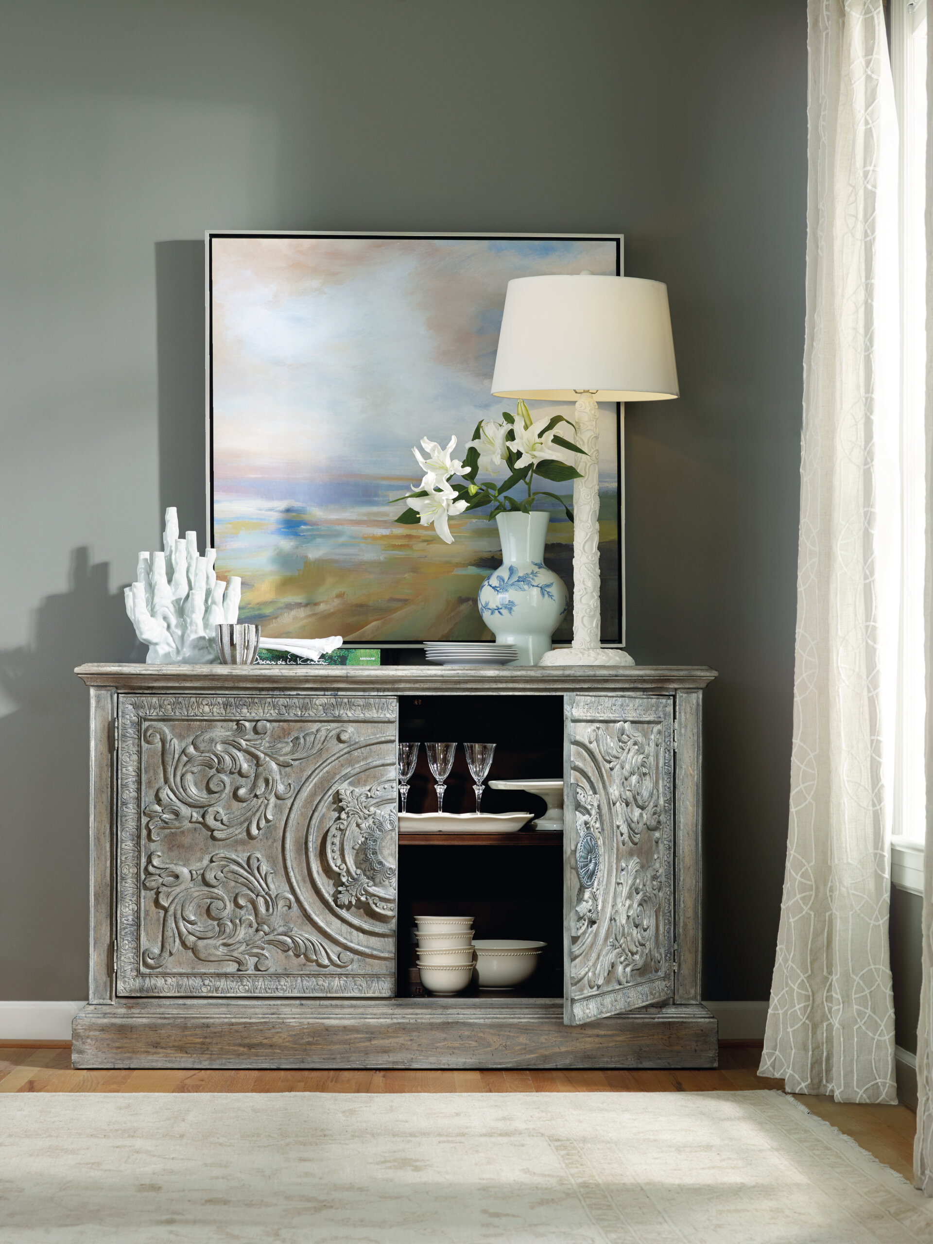 Featuring an intricately carved floral patterned front and an opulent, oversized center pull in an aged silver tone, the Mélange 2-door Accent Console is a stunning focal point in a soft driftwood-tone finish with whitewash paint. One adjustable wood shelf behind the pair of doors and a ventilated back panel.