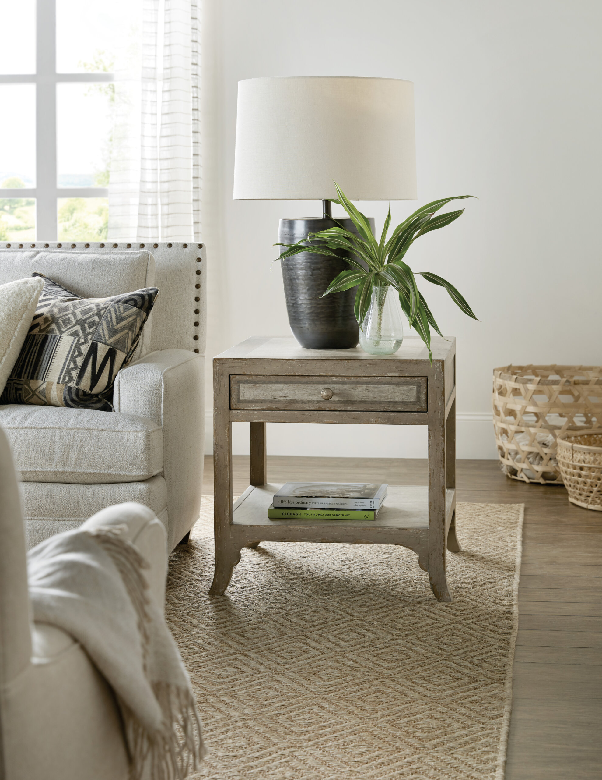 With the casual look and feel of a timeless piece acquired during travels in the Old World, the Piazza End Table has flared shaped legs and contrasting finishes on the top and drawer fronts, and offers one drawer and one fixed shelf. Crafted of Oak Veneers with handpainting, the Piazza is finished in Sorrento, a soft taupe blended with a gray two-tone paint, a mixture of Weathered Shale and Light Tusk. The knob pull is in a hand hammered Florentine gold color.
