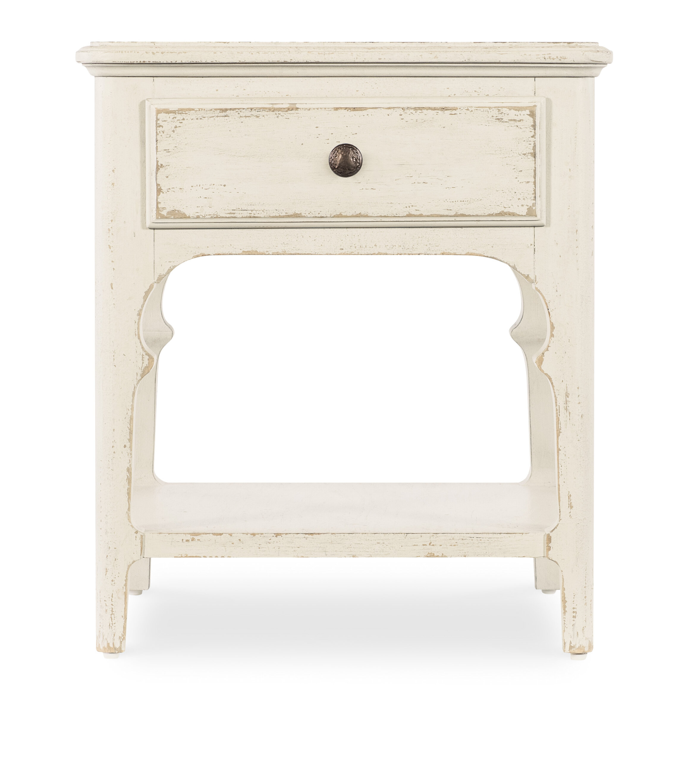 In a classic, charming design with a nostalgic flair, the 26W x 30D square-shaped Americana End Table has scalloped shaped legs and is finished in the time-worn white Daisy over Cathedral Oak Veneers. The finish represents the natural wear one might expect of pieces passed down through the family over time, revealing the rich oak character beneath. The table has a Solid-Wood Edge top, one self-closing drawer with drawer interiors in the Honey finish, one fixed shelf and metal alloy bar pulls in an antique bronze finish.