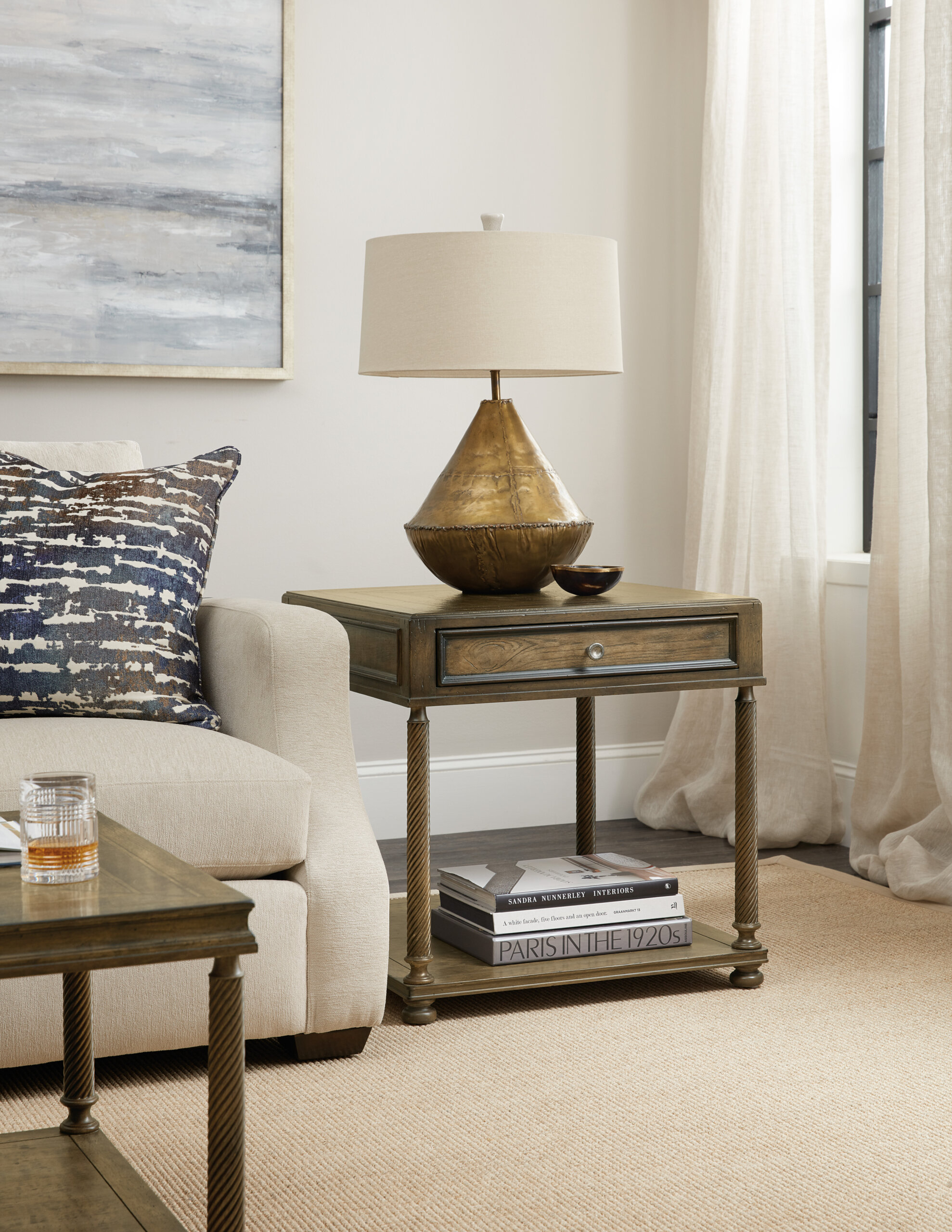 Taking the best design elements of classic American traditional styling to create a comfortable, casual look for today’s modern interiors, the Vera Cruz End Table features a russet brown Rosecliff finish slightly distressed and soft to the touch. Crafted of Walnut, Maple, Oak Veneers and metal, the table has one drawer with self-closing undermount guides, one fixed shelf and knob hardware in an aged pewter finish.